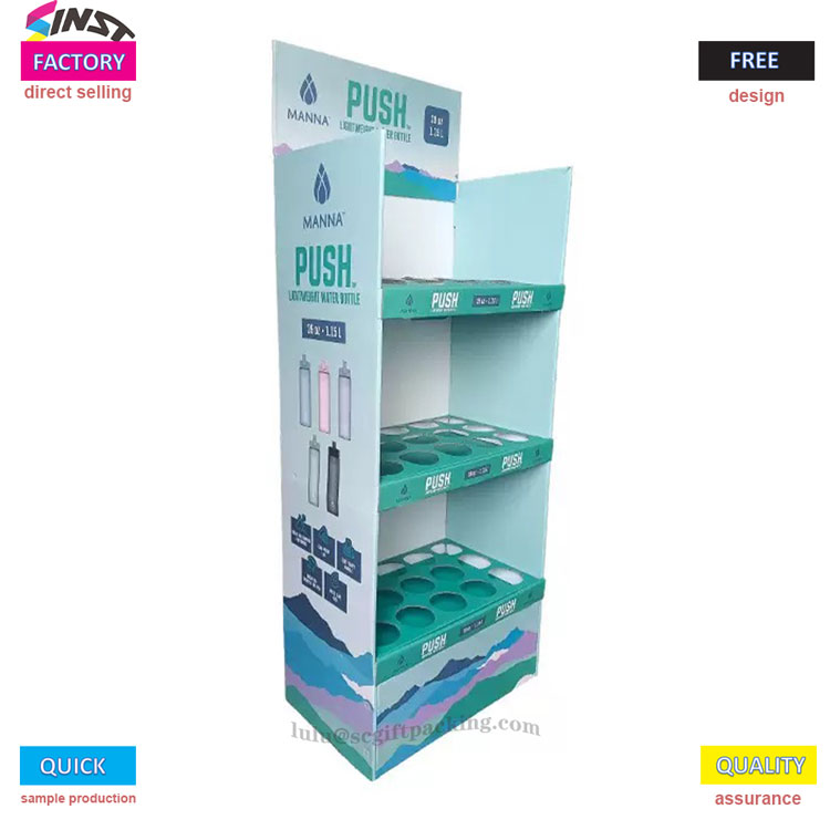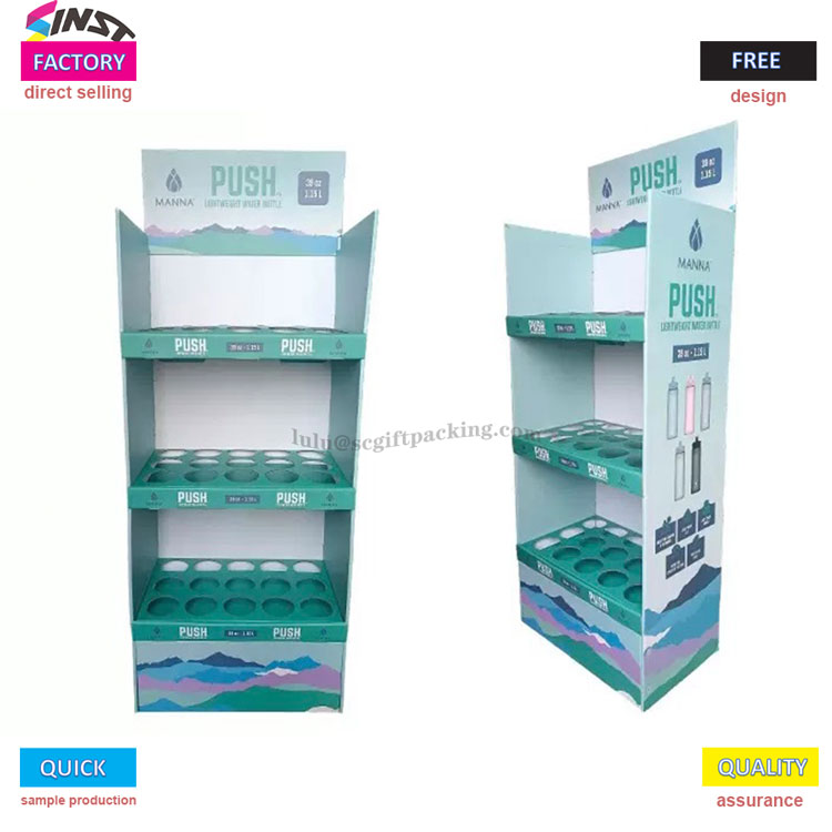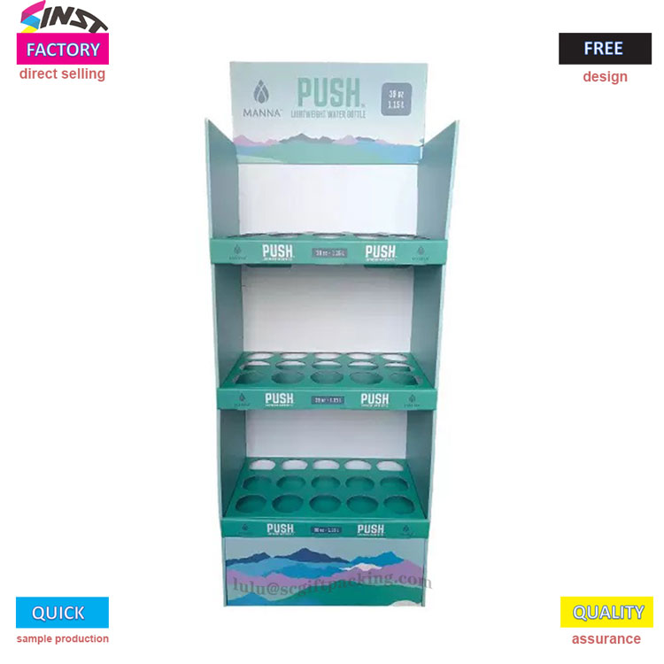 Tato kartonová podlahová podlaha je stojan na láhev s vodou Supermarke má třívrstvý design struktury mřížky, s kruhovými drážkami na každé vrstvě, aby přesně držel láhev s vodou a zabránil válcování. Logo značky lze vytisknout nahoře a produktová grafika lze vytisknout na boku, jednoduché a špičkové. Používá se hlavně pro zobrazování produktů, jako jsou lahve na vodu, šálky, šálky na mléčný čaj, termoskové šálky atd.