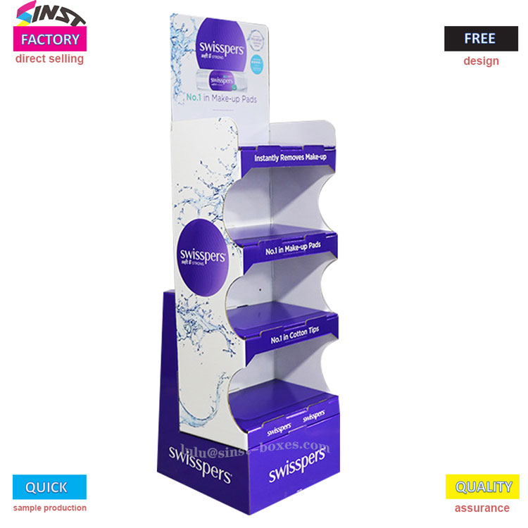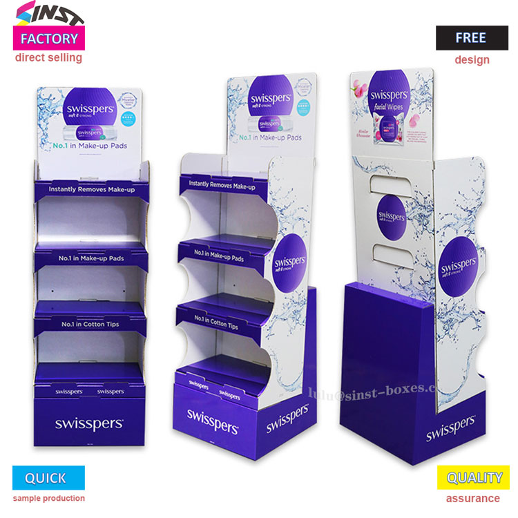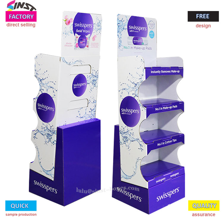 Nejvýraznějším rysem našeho stojanu na mokré ubrousky je gravírování „brand first“ v očích zákazníků – přední, boční a spodní strana jsou hustě potištěny sloganem „category first“. Bílý základ je zdoben fialovou barvou a na horní propagační tabuli je nápis „Facial Wipes“ a „Instantly Remove Make up“, přičemž název značky je skrytý i podél okraje drážky. Na první pohled zákazníci vidí, že regály jsou zaplněny těmi nejprofesionálnějšími signály, ať už jde o nákup odličovací vaty nebo vlhčených ubrousků, cítí, že jeho volba je rozhodně správná volba. Používání v supermarketech a kosmetických obchodech se rovná udělení „certifikace prodejní koruny“, což je efektivnější než propagace prodejců.